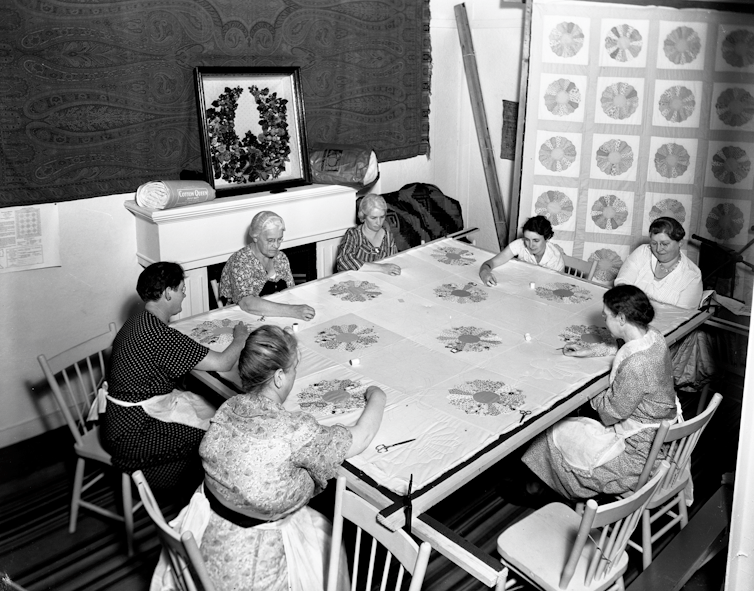 Quilting bees gained new popularity during the First and Second World Wars. Women’s Institutes, the Imperial Order Daughters of the Empire, the Canadian Red Cross and countless community and private groups mobilized women and opened make-shift workspaces including in libraries, homes and schools for charitable war-time production.