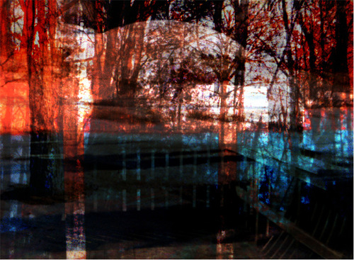 Stephen Broomer’s photography draws from diverse influences such as the calligraphic palimpsest paintings of Cy Twombly and the avant-garde films of Bruce Baillie. As in Twombly’s late polaroids, Broomer’s work is also committed to eternal and mythological themes: Midland has its origins in his film Brébeuf, shot at sites in Midland, Ontario that were central in the missionary and ethnographic work of Jean de Brébeuf, who, along with Gabriel Lalament, was martyred by the Iroquois at St. Ignace II in 1648, a consequence of their mission to convert Hurons to Christianity. The images originate on 16mm motion picture film, and then through a series of chance operations, are combined digitally to create densely layered collages. The resulting images combine landscapes with other photographic subjects and solid colours, creating collisions between forms.
